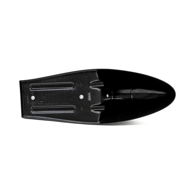 Universal Café Racer seat with black synthetic leather upholstery. Longer in length, designed to fit longer frames, but this seat still manages to fully retain the typical classic shape. The seat cowl and seat base are two separate parts. The base comes with 3 M6-Steel plus nuts mounting points for easy installation. Made from unpainted black ABS plastic and comes with 20mm thick seat foam that is covered with a water repellent membrane below the synthetic leather upholstery. This 'C' seat cowl comes smooth, without the mounting spot for a taillight, for those with another taillight solution. Note: Installation modifications may be required. Note: Seat comes unpainted.
